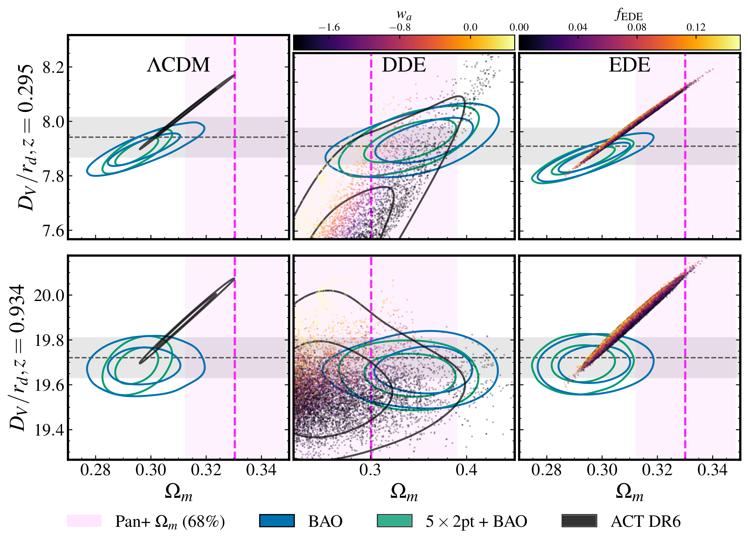 Testing extended cosmological models: Comparison of constraints from BAO+LSS data (blue/green) versus CMB data (black) in ΛCDM, early dark energy (EDE) and dynamical dark energy (DDE). The consistent addition of multiprobe LSS data heightens the tension in ΛCDM and leads to a mild preference for these extended models which can help to reconcile this. From Reeves et al. (2025b).