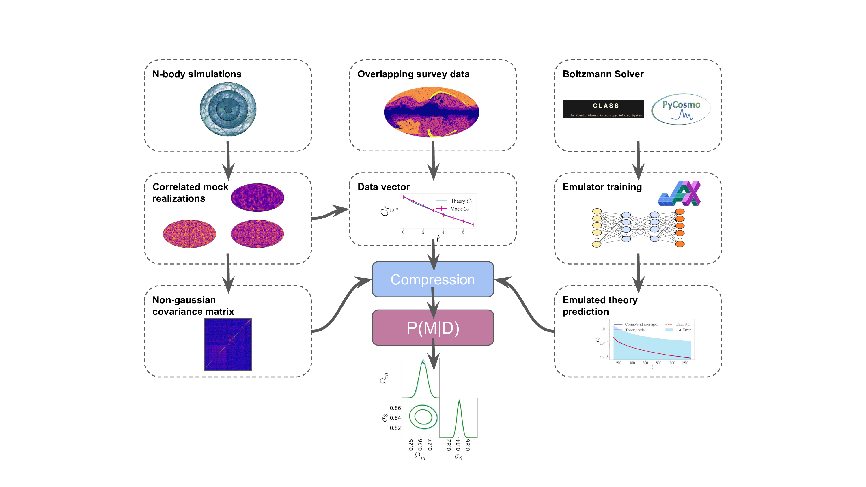 During my PhD, I built an end-to-end, differentiable pipeline that combines multiple cosmological probes—weak lensing, galaxy clustering, BAO, CMB primary anisotropies, integrated Sachs-Wolfe effect, and CMB lensing—in a single, self-consistent inference framework. This includes simulation-based covariances, fast emulators, and cross-correlation measurements to maximise information while controlling systematics across datasets.